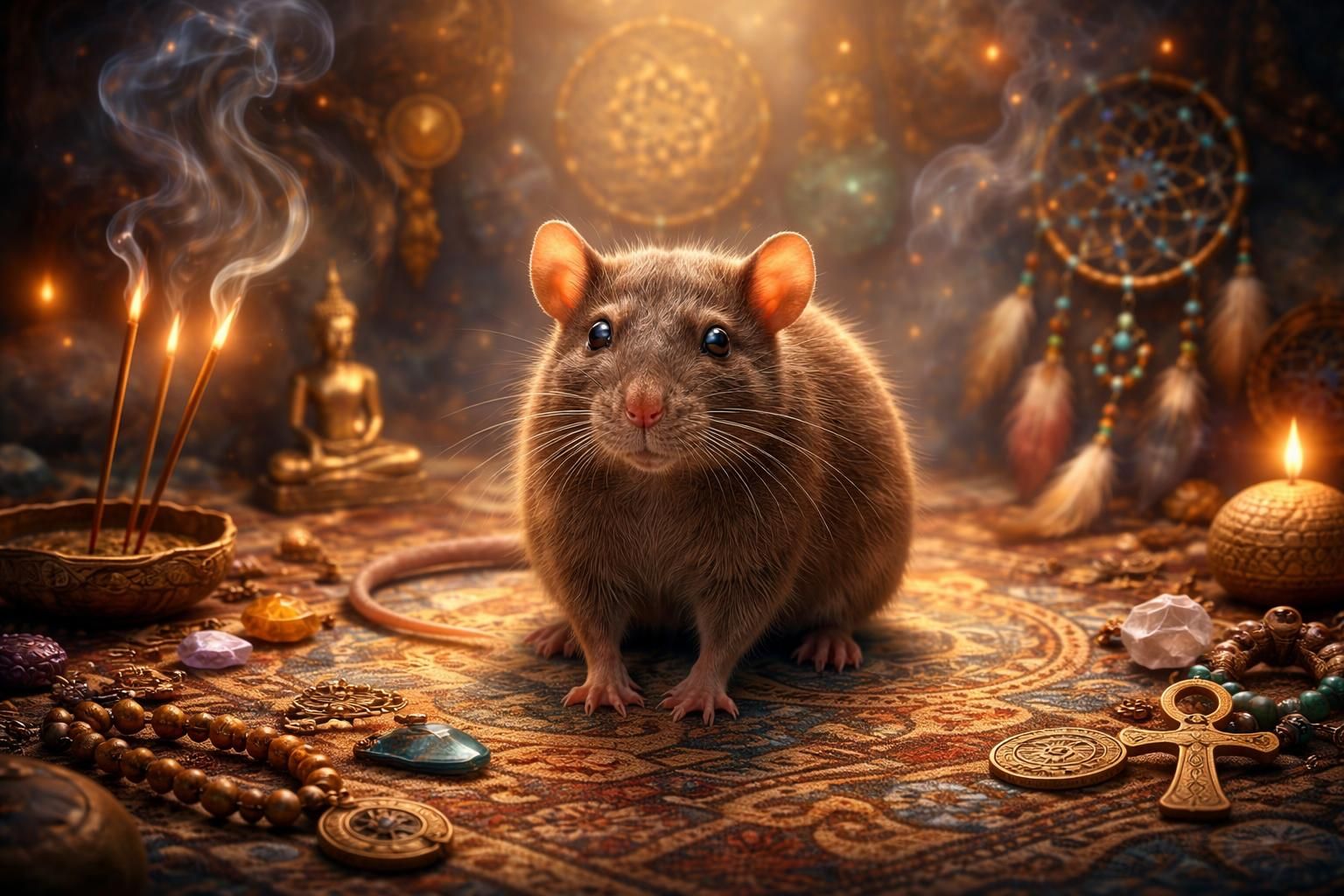 Dans la tradition hindoue, le rat est associé à la sagesse et à l’intelligence, incarné par la monture du dieu Ganesh, qui est souvent représentée en compagnie d’un rat. Ce lien souligne l’importance de cet animal comme symbole de capacité à surmonter des obstacles et à trouver des solutions là où d’autres échouent. Le temple de Karni Mata en Inde, où les rats sont vénérés comme des êtres sacrés, témoigne de la position élevée que cet animal occupe dans certaines cultures, en tant qu’auxiliaire spirituel respecté.